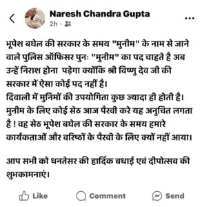कहते है कि भूपेश बघेल की सरकार में एक अधिकारी की तूती बोलती थी वे पुनः बीजेपी की साय सरकार में मुनीम का पद चाह रहे है। जी हाँ ऐसा कहना है भाजपा नेता और अधिवक्ता नरेश चंद्र गुप्ता का। उन्होंने इसको लेकर सोशल मीडिया पर एक पोस्ट डाला है जिसमे लिखा है कि “भूपेश बघेल की सरकार के समय “मुनीम” के नाम से जाने वाले पुलिस ऑफिसर पुनः “मुनीम” का पद चाहते है अब उन्हें निराश होना पड़ेगा क्योंकि श्री विष्णु देव जी की सरकार में ऐसा कोई पद नहीं है। दिवाली में मुनिमों की उपयोगिता कुछ ज्यादा ही होती है। मुनीम के लिए कोई सेठ आज पैरवी करे यह अनुचित लगता है। वह सेठ भूपेश बघेल की सरकार के समय हमारे कार्यकताओं और वरिष्ठों के पैरवी के लिए क्यों नहीं आया।” लेकिन सवाल यह खड़ा होता है कि अधिवक्ता नरेशचंद्र गुप्ता का इशारा कौन से सेठ की तरफ है। वे क्या इसकी शिकायत केंद्रीय स्तर पर करेंगे।